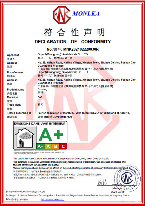 杜邦漆秉承诚信经营、恪守商业信誉、坚持公司承诺,向客户提供一流产品、一流服务。先后获得“全国质量检验稳定合格产品”、“绿色环保推荐产品”、“重质量.讲诚信示范企业”、“产品质量信得过单位”、“法国A+认证”等多项荣誉。